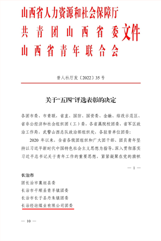 近日,根據(jù)《山西省人力資源和社會(huì)保障廳、共青團(tuán)山西省委關(guān)于“五四”評(píng)選表彰的決定》(晉人社廳發(fā)〔2022〕35 號(hào)),山西焦煤山煤國(guó)際經(jīng)坊煤業(yè)團(tuán)委被評(píng)為“山西省五四紅旗團(tuán)委”。
