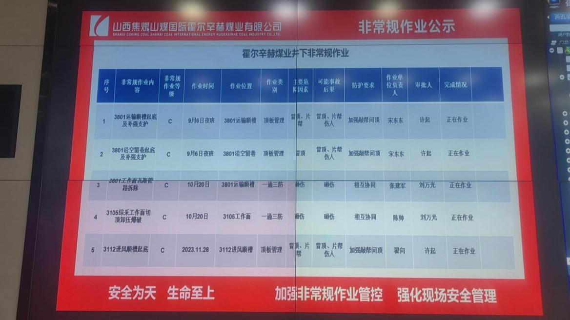 2023年以來,霍爾辛赫煤業將安全監督作為建設“新焦煤大監督體系”的重中之重,建立健全非常規作業安全管控管理辦法,完善安全生產領域專項監督措施,壓實各層級安全監管責任,牢牢守住安全生產底線。
